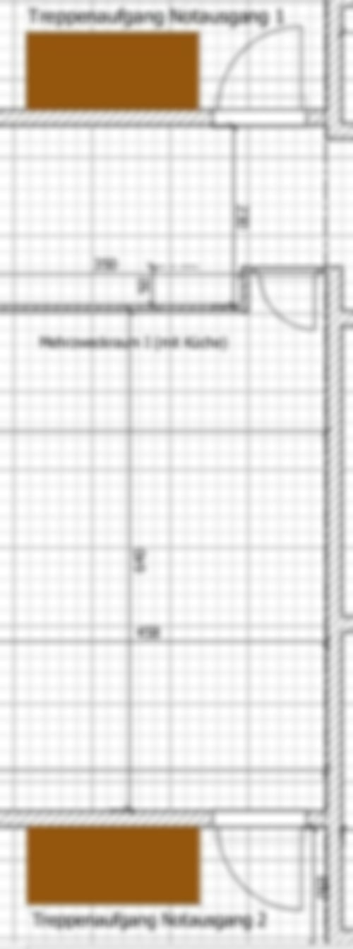 - Zwei Notausgänge / Nebeneingänge mit einer Treppe sollen rechts und links (Notausgang 1 & 2 in der Zeichnung) eingebaut werden Parkraum geht dabei kaum verloren